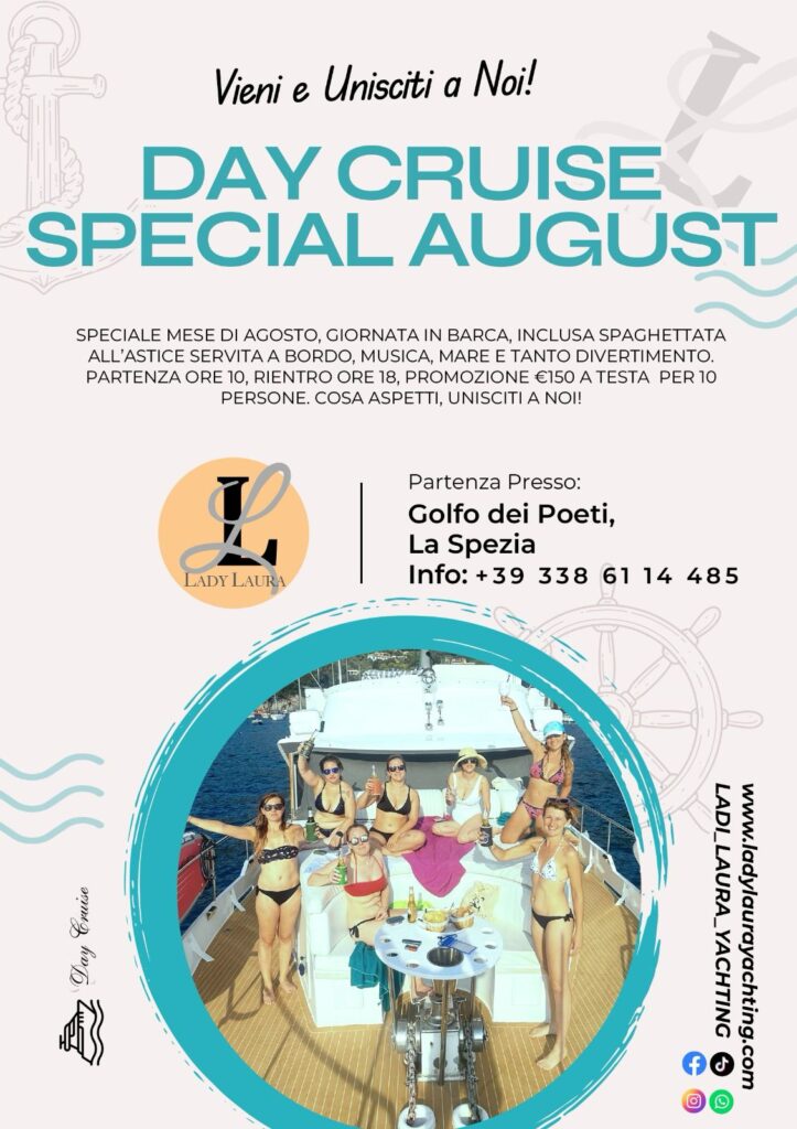 Goditi il mare estivo di La Spezia a bordo della nostra Lady Laura, una favolosa imbarcazione d’epoca di 20 metri. Dotata di 5 cabine doppie per i nostri ospiti, ognuna con tanto di bagno privato.